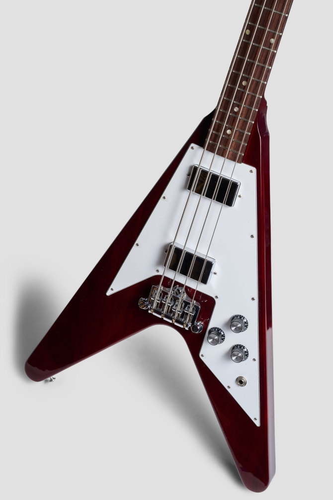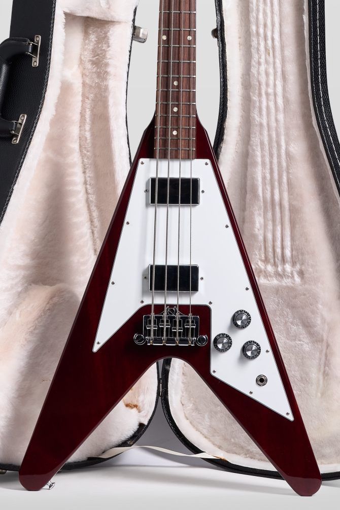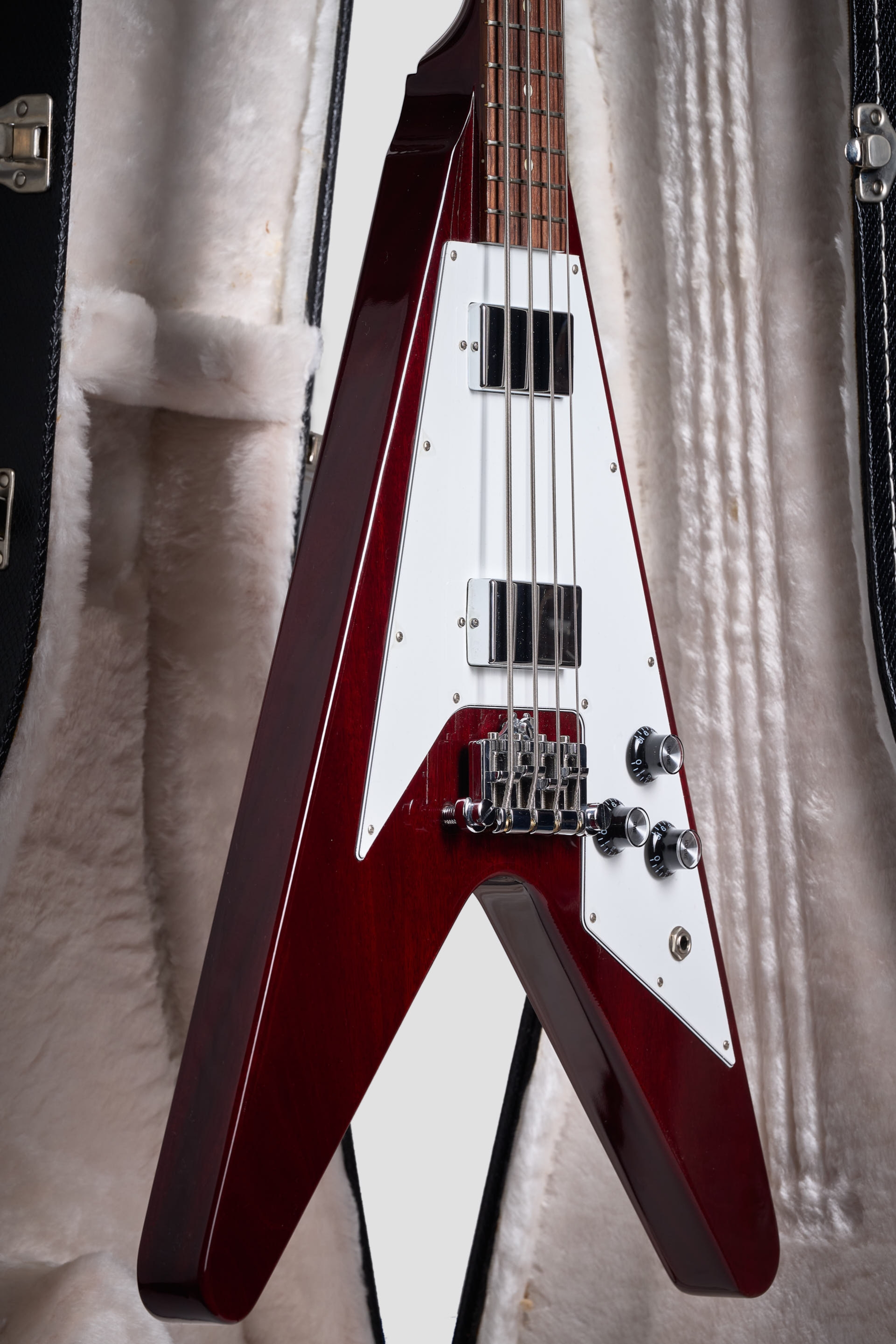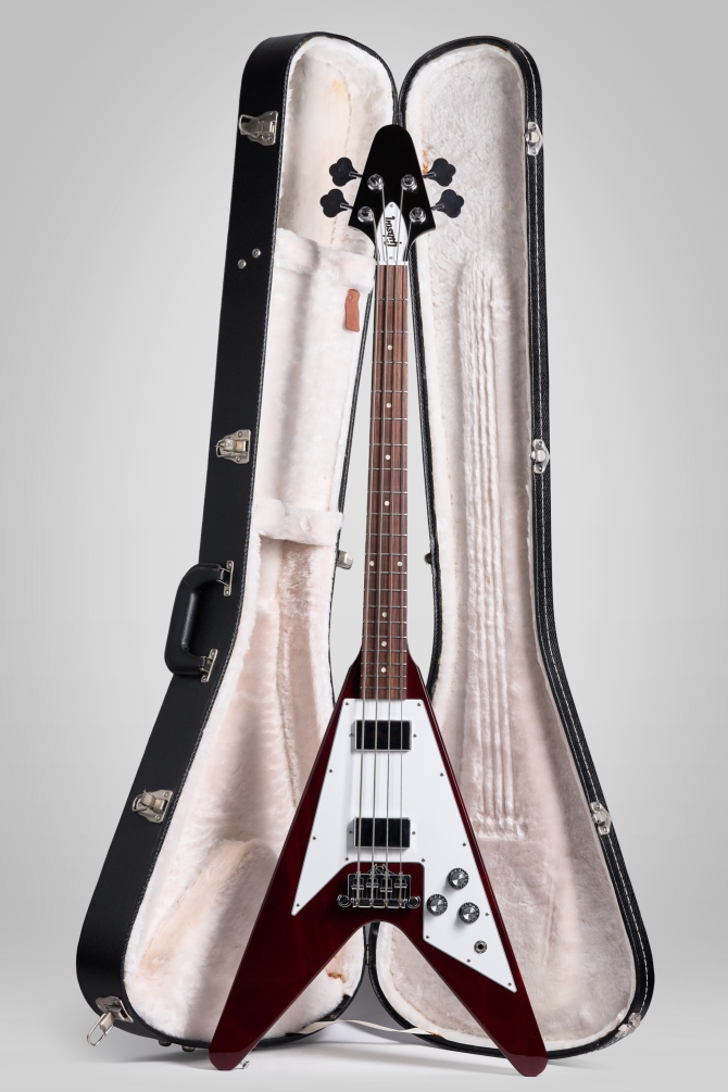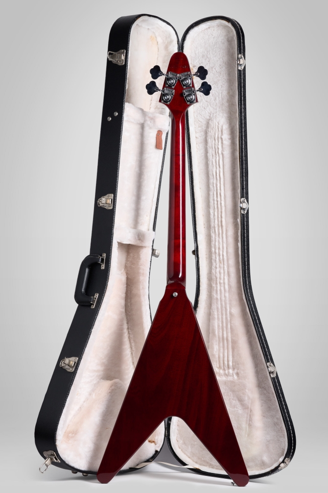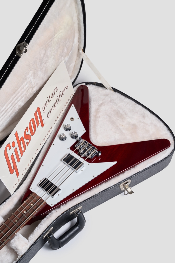 Hoy tenemos el agrado de presentarles, (¡por primera vez!) este Gibson Flying V Bass del año 2011 en un Cherry gloss finish en excelente estado y prácticamente sin uso.