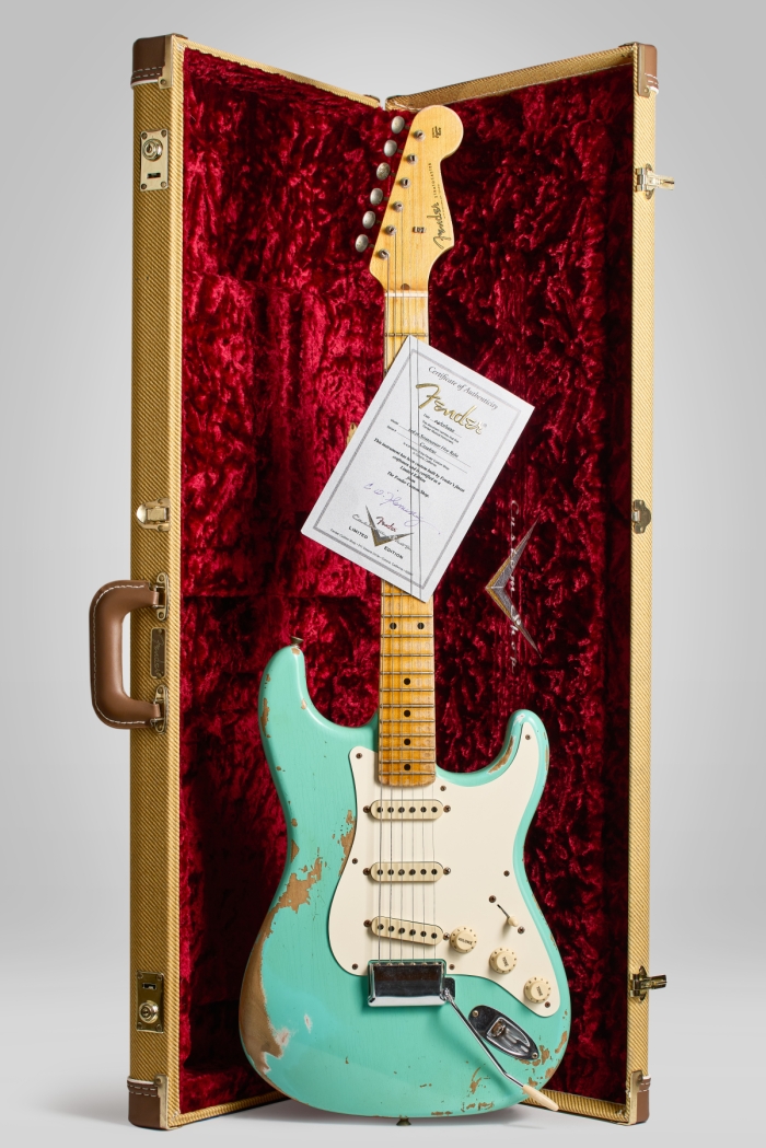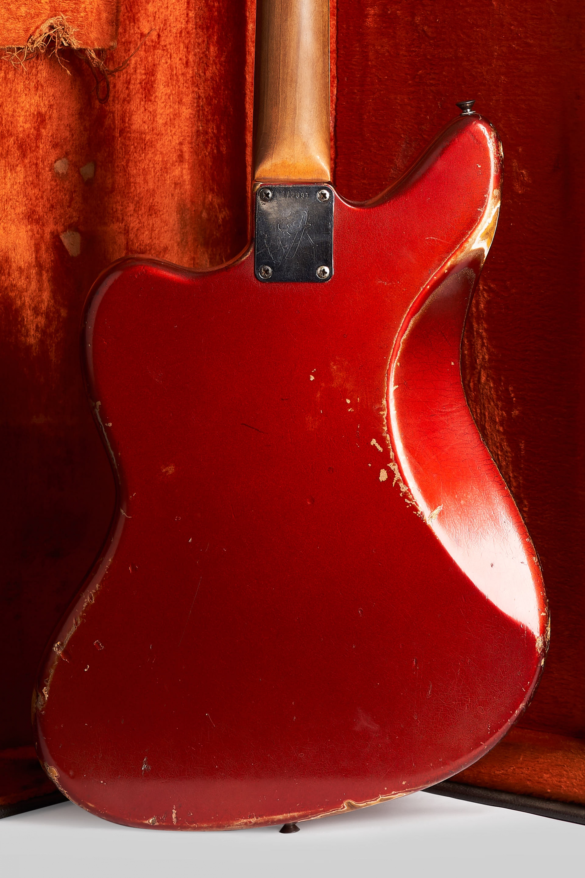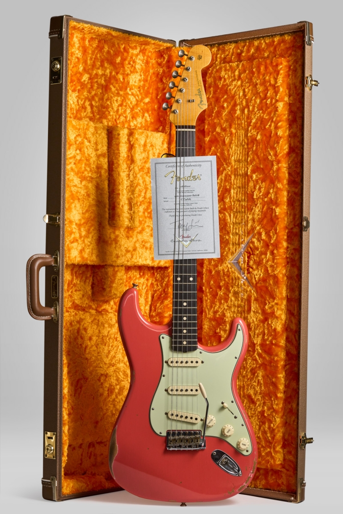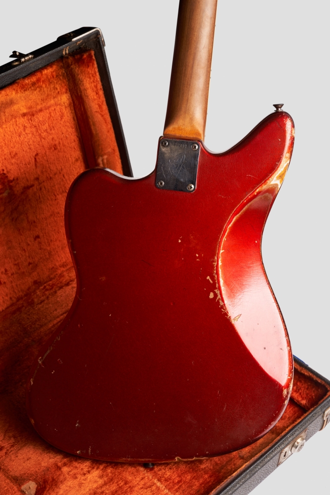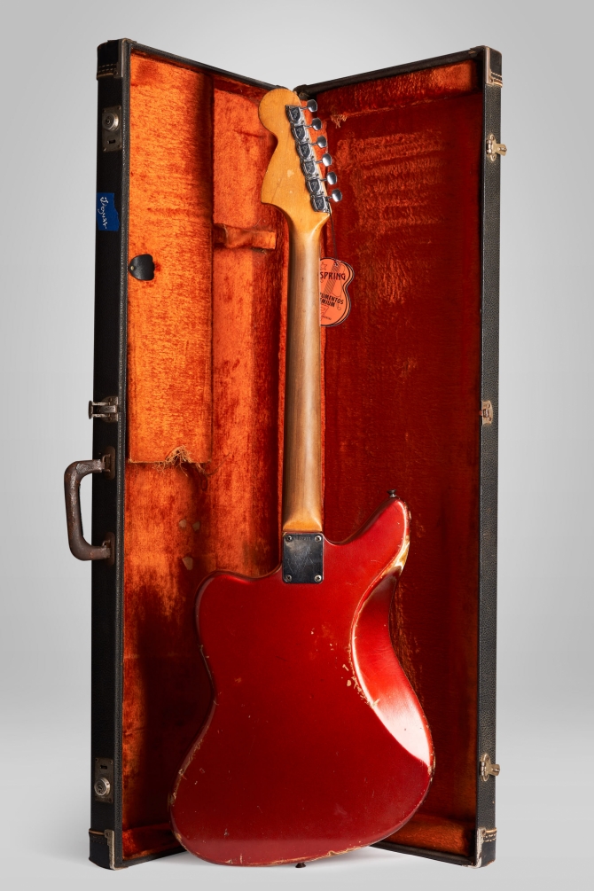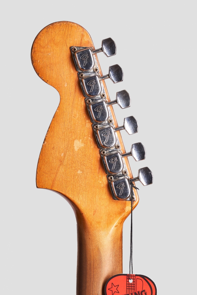 La guitarra tiene signos de mucho uso durante sus pasados 57 años, nada que un poco de cariño y una puesta a punto lo pueda solucionar. Al fin y al cabo qué mejor que un instrumento haya sobrevivido durante tantos años a grabaciones y giras. Se encuentra 100% original salvo por su palanca de vibrato y 4 de sus 6 selletas del puente. Clavijas originales sin extra-holes, pick-ups, cables y pickguard intactos. En el mango vemos estampado 15 NOV 66 B a lo que se refiere como 15 de Noviembre de 1966. 'B' es la medida del ancho de cejilla, en este caso B = 1 5/8". El muteador se encuentra en el interior del case en perfectas condiciones.