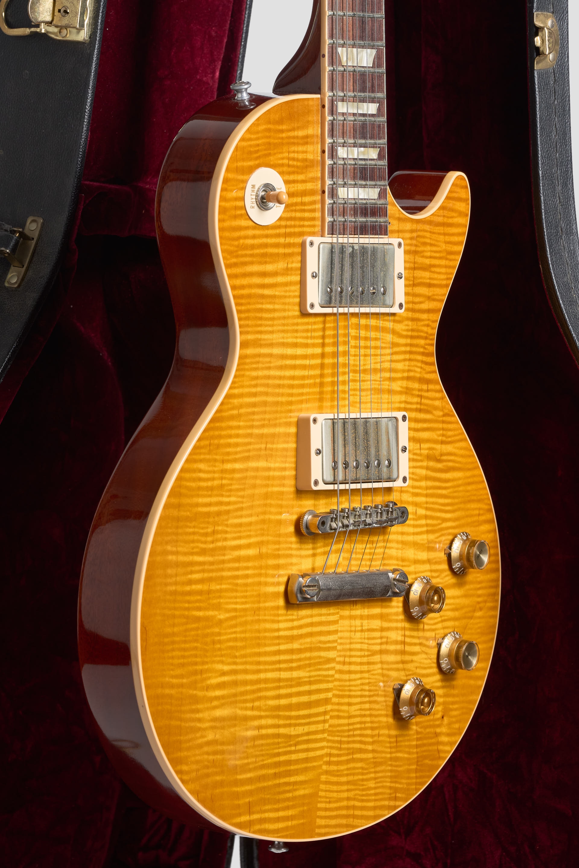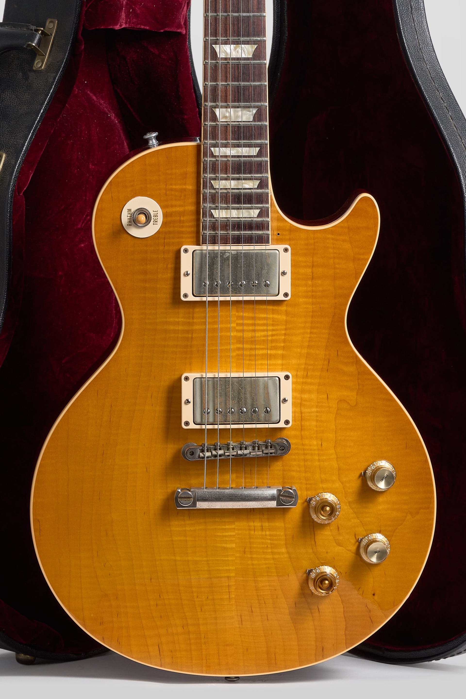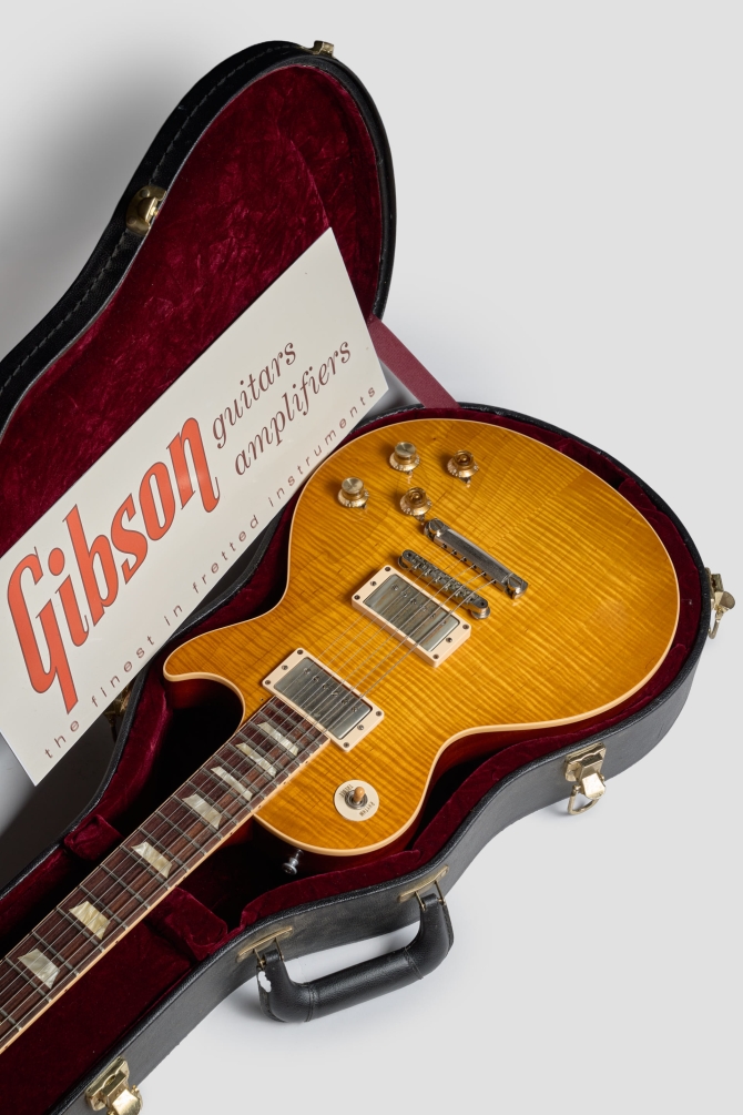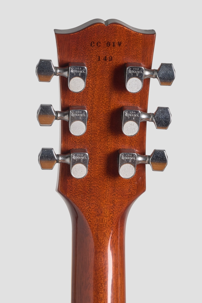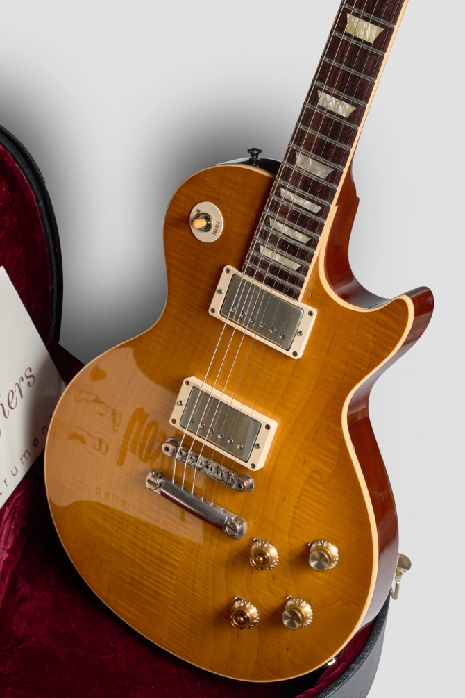 La #1 se encuentra en excelentes condiciones, posee un par de Burst-buckers replicando el audio original de los PAF de Green con el pick-up del neck puesto a la inversa, herrajes de nickel, potes CTS y capacitores Bumble Bee. Una Custom Shop única.