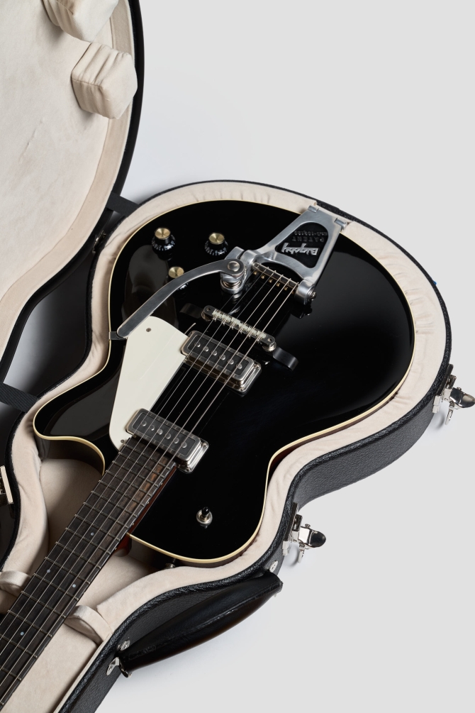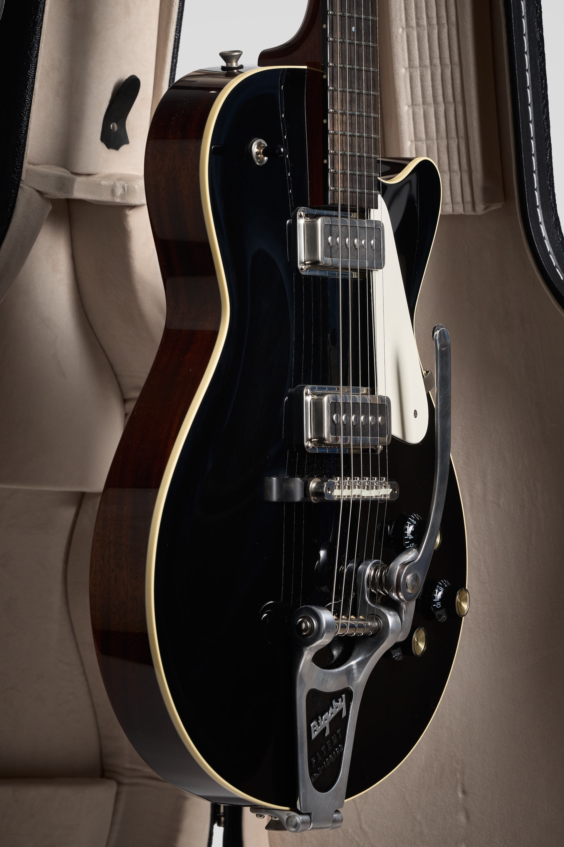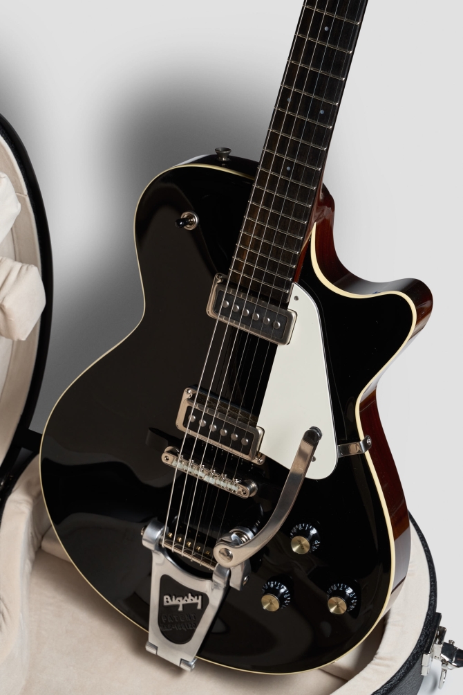 Para los que buscan la potencia de un pick-up de bobinado más alto con la fidelidad y claridad de un autentico pick-up vintage de bobina simple, encontrarán lo que buscan con los 'Ellisonic pick-ups' ajustables. Para coronar, un Bigsby B3 con una cremosidad poco vista en Bigsbys nuevos. Que resorte!