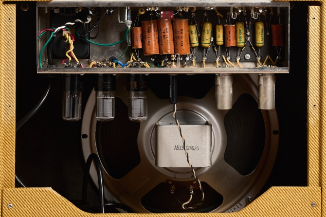 El amplificador propone un circuito clásico de los 50's 5E3 reedición del '57 con un parlante Rola original del año 1959, capacitores Domino de los 60's, zócalos de baquelita NOS y válvulas RCA.