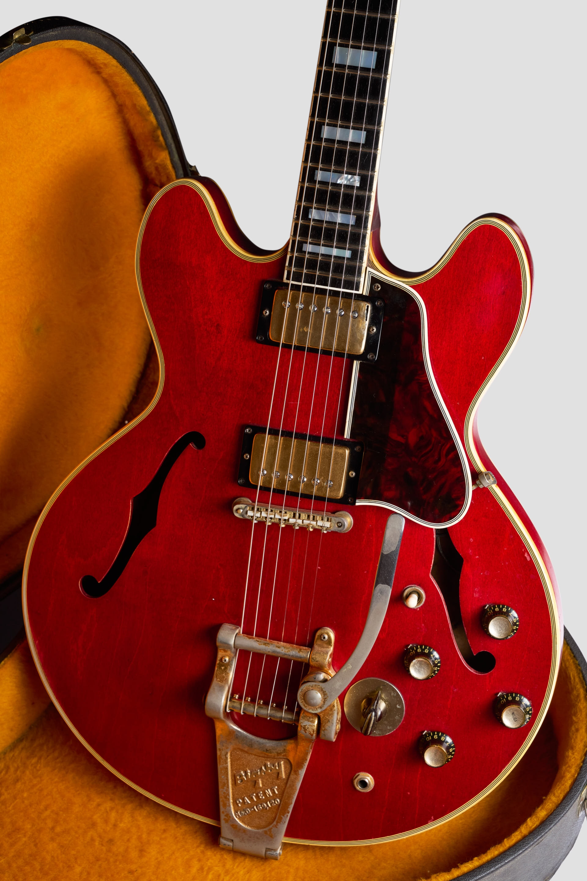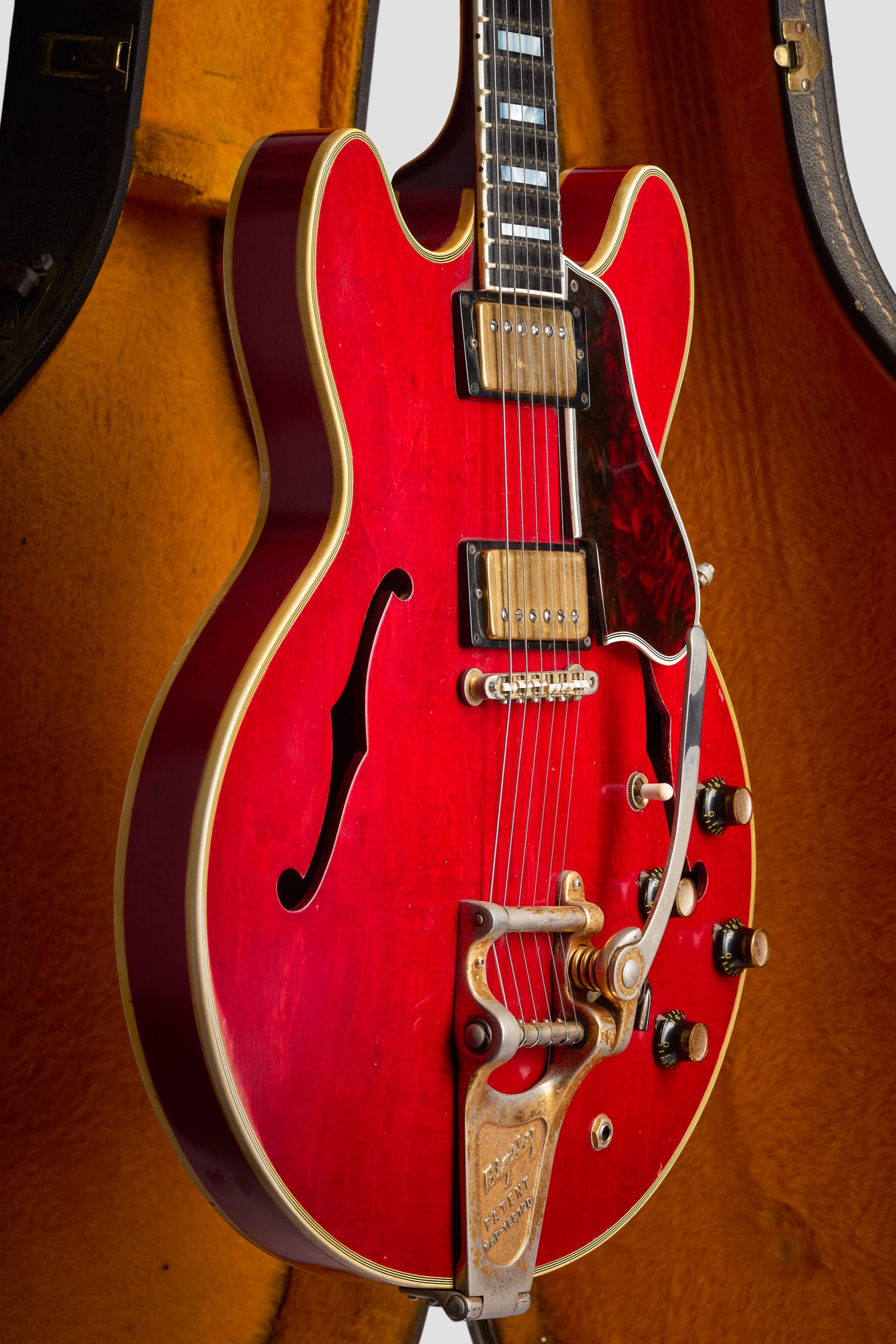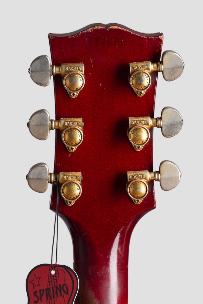 Este ejemplar lo tiene todo desde el fino Cherry Faded, los herrajes de gold-nickel, pick-guard nacarado, su varitone de 6 posiciones y sus micrófonos no originales de la guitarra pero si de la época Pat. Num. humbuckers.