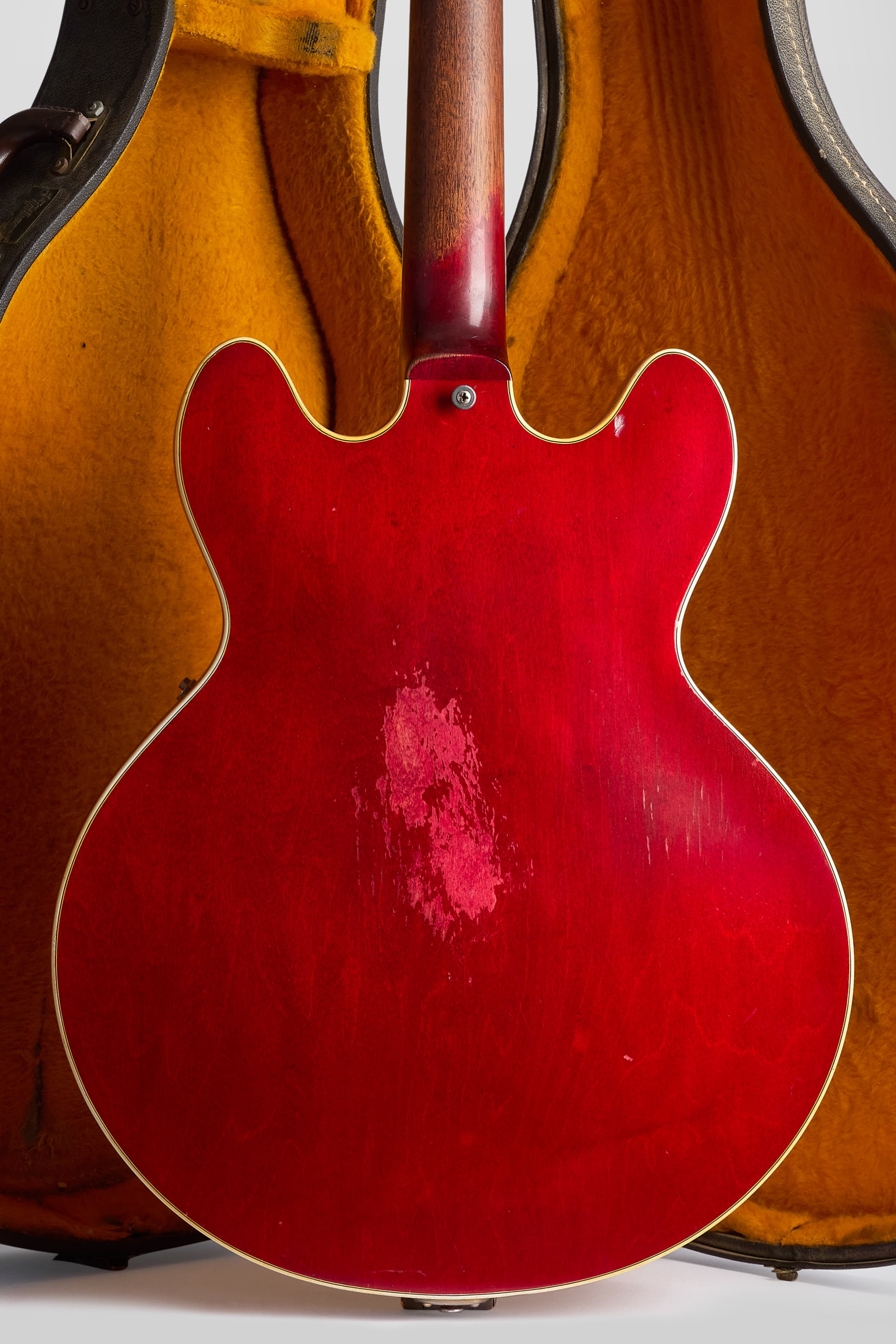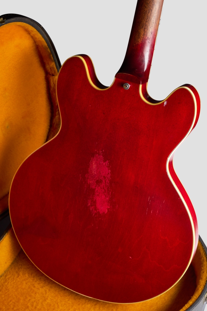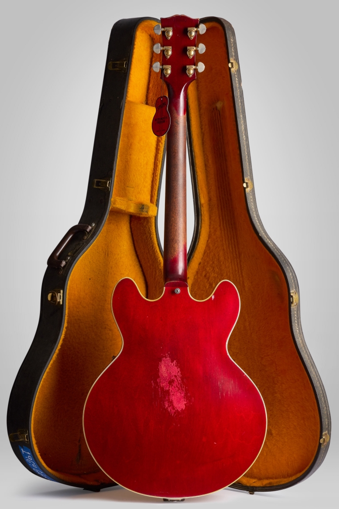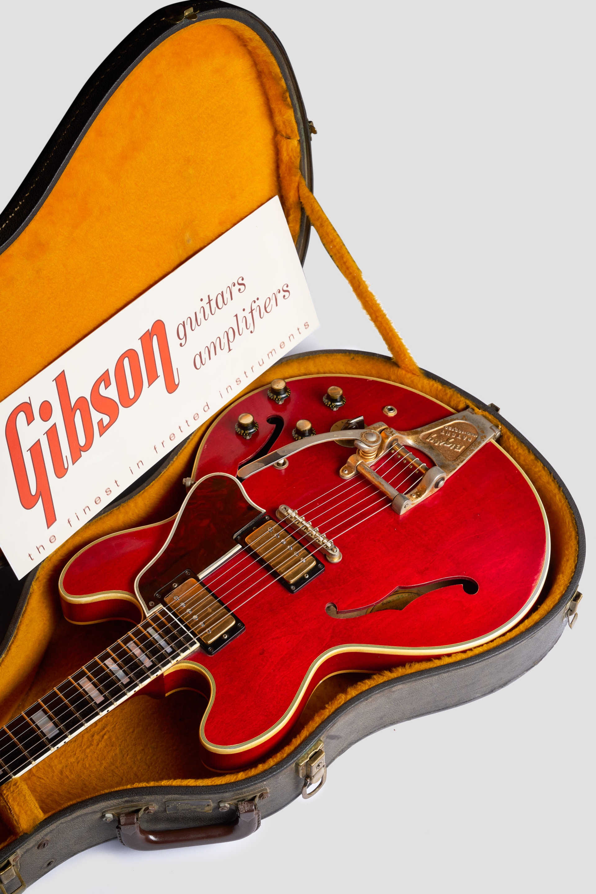 Este ejemplar lo tiene todo desde el fino Cherry Faded, los herrajes de gold-nickel, pick-guard nacarado, su varitone de 6 posiciones y sus micrófonos no originales de la guitarra pero si de la época Pat. Num. humbuckers.