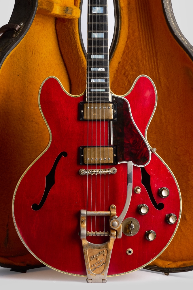 Hoy tenemos para presentar a la reina hollow-body indiscutida de Gibson. Con ustedes la Gibson ES-355 TDSV (thinline-dual-pick-up-stereo-varitone) del año 1964 en un Cherry finish sutilmente faded. Sin palabras.