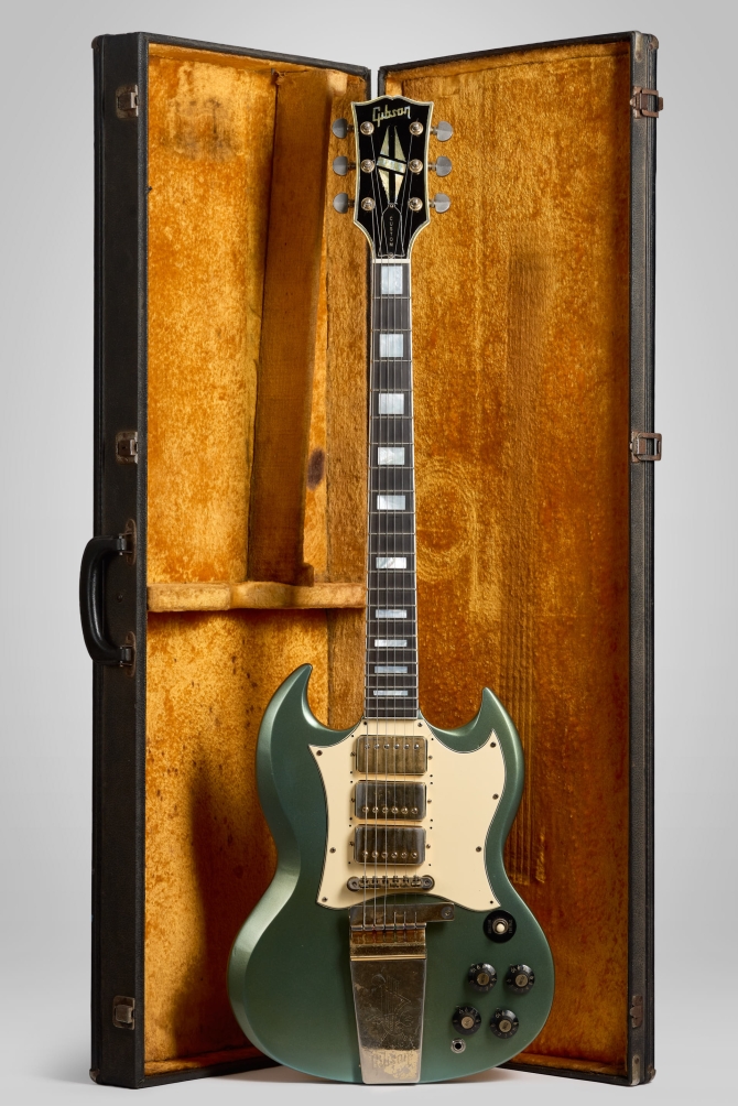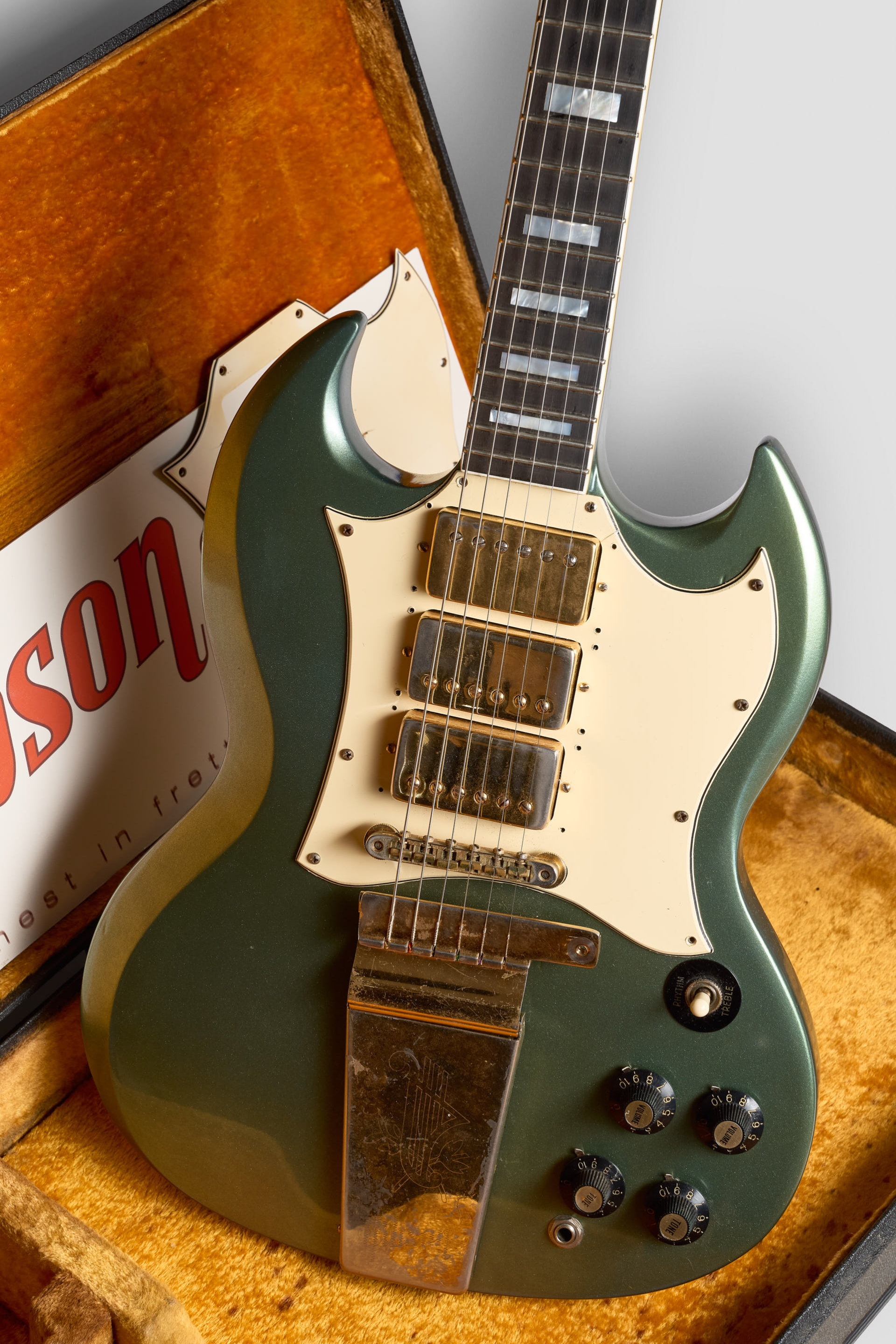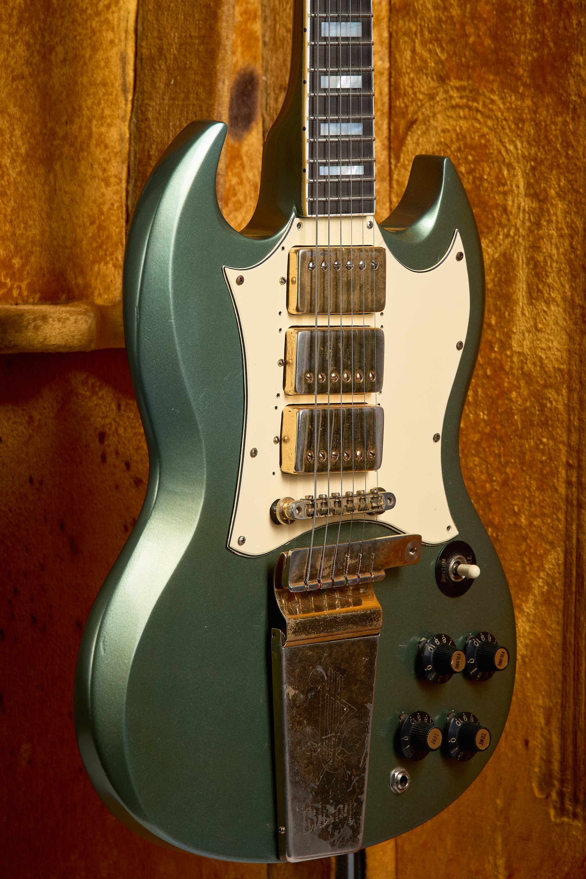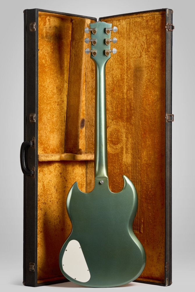 La SG conserva sus micrófonos Pat. Number originales sellados. El pickguard fue remplazado, el original, en el case. Fue re-entrastada con trastes 6105 y las clavijas remplazadas por unas Ibanez. Potes, perillas witch-hat & Lyre Vibrola originales. Definitivamente a sido un instrumento con historia pero poco sabemos.