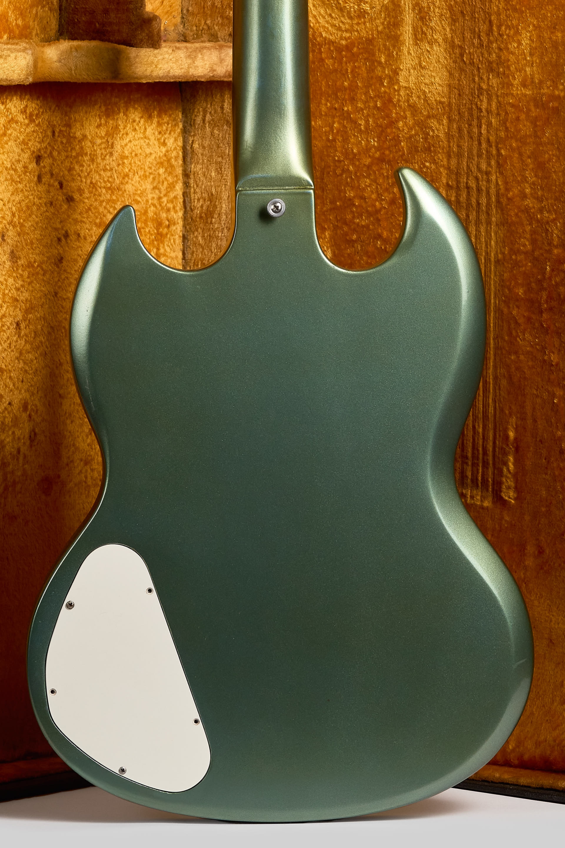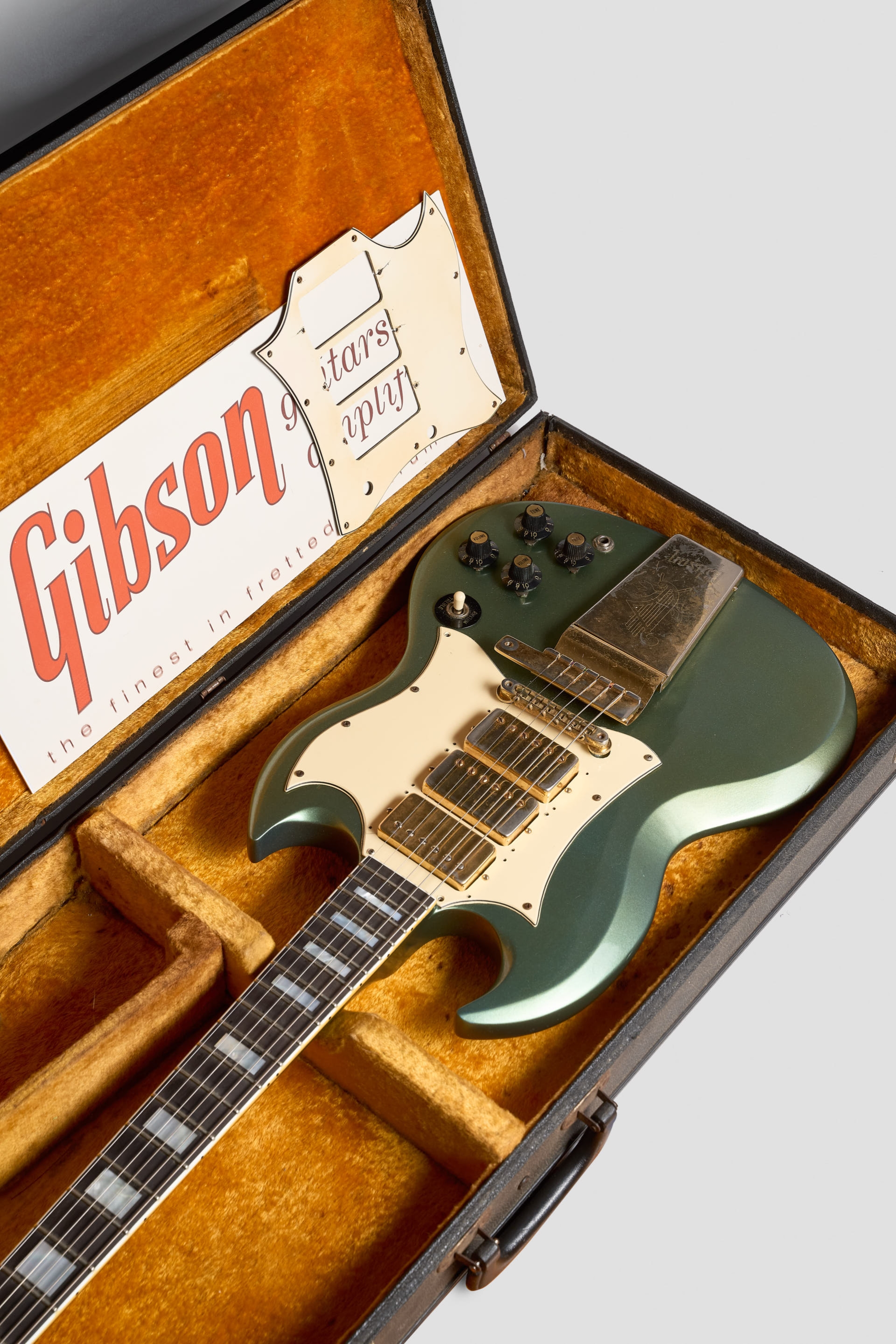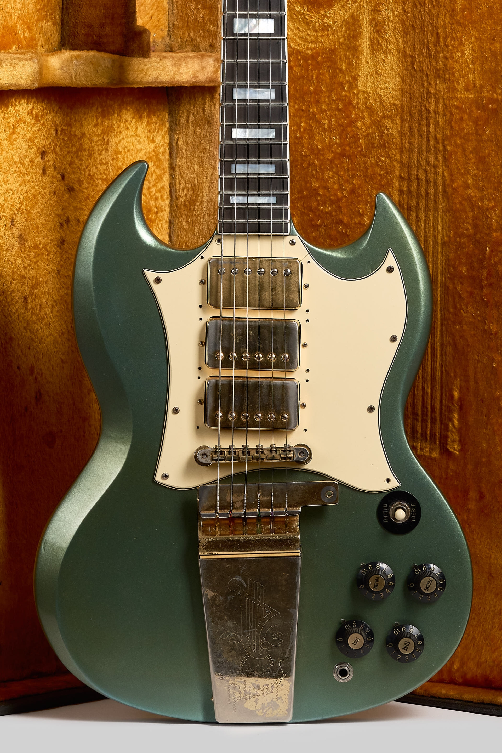 La SG conserva sus micrófonos Pat. Number originales sellados. El pickguard fue remplazado, el original, en el case. Fue re-entrastada con trastes 6105 y las clavijas remplazadas por unas Ibanez. Potes, perillas witch-hat & Lyre Vibrola originales. Definitivamente a sido un instrumento con historia pero poco sabemos.
