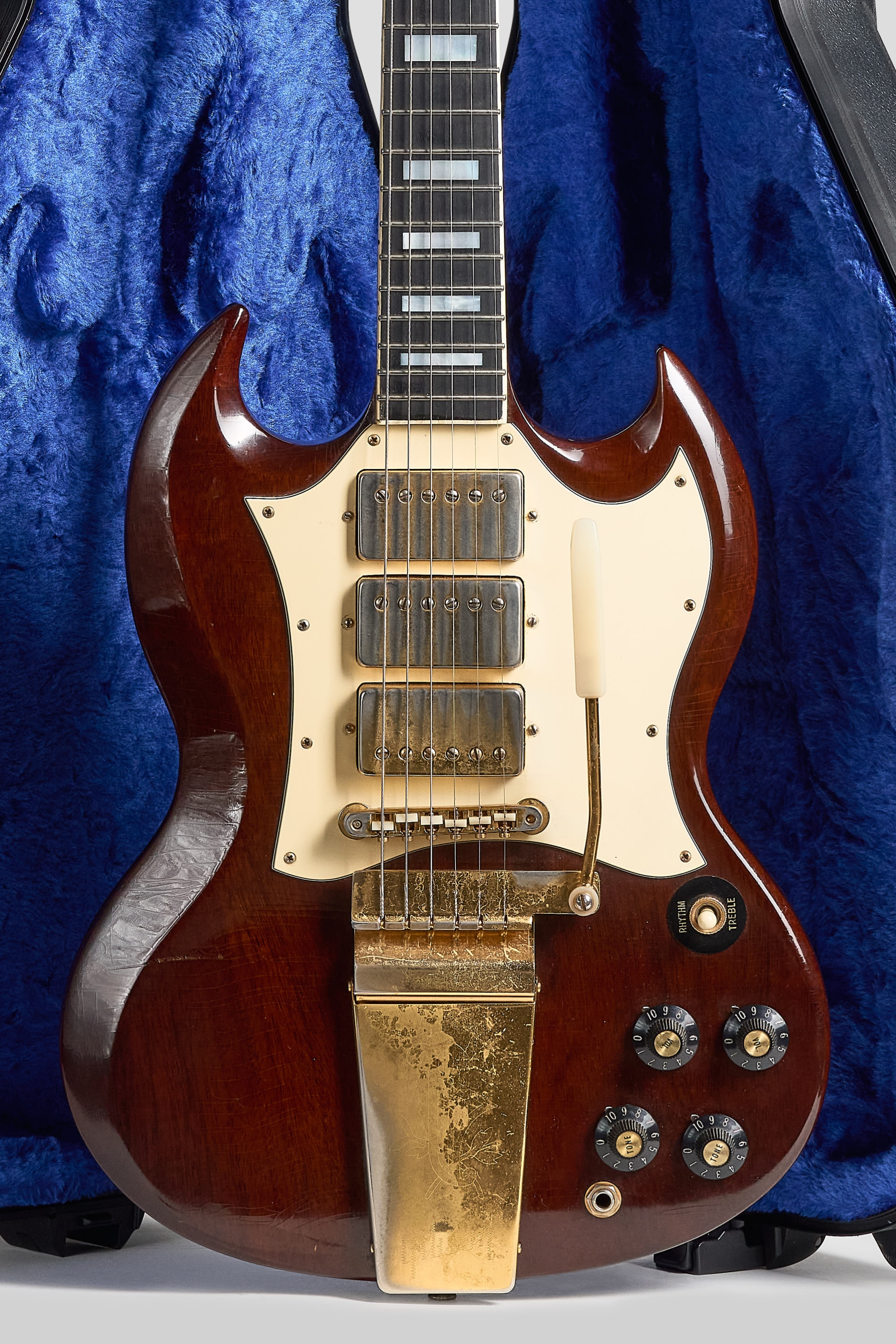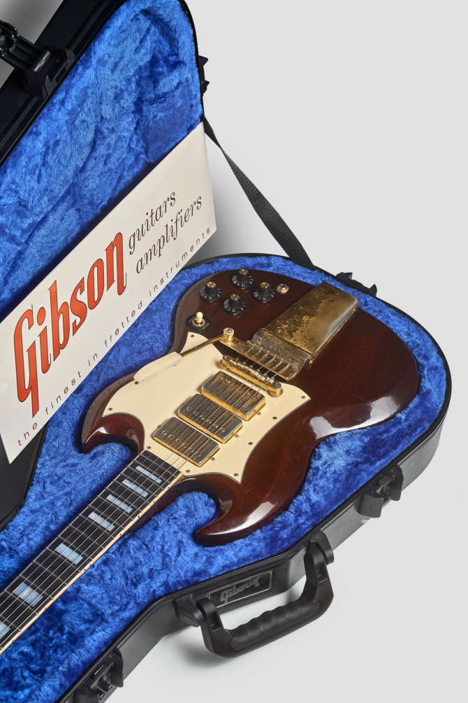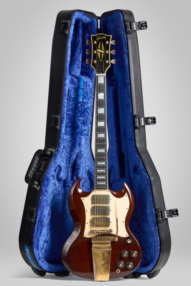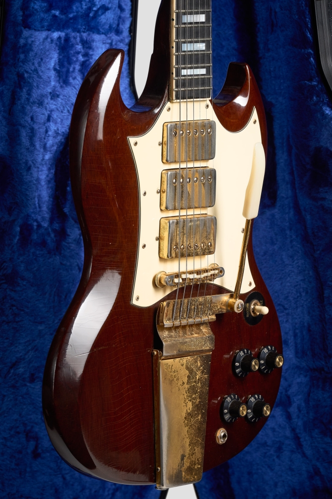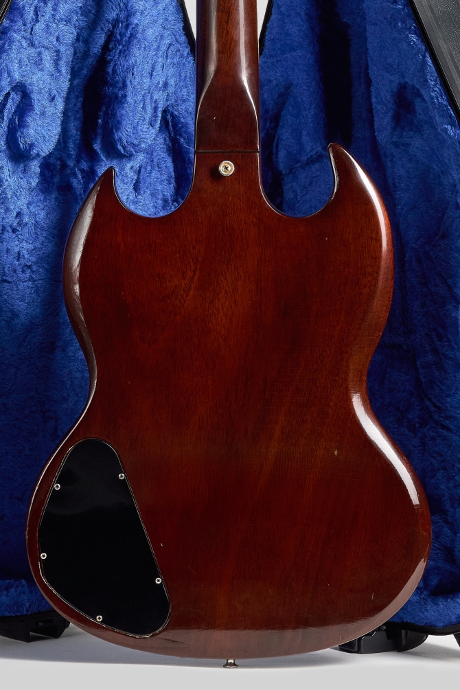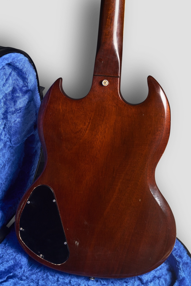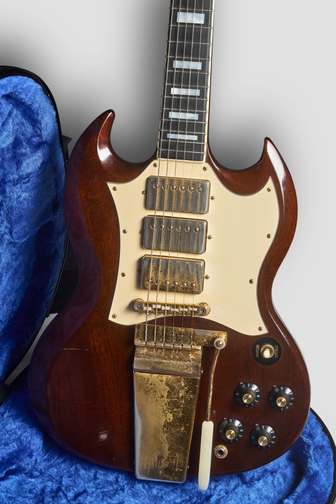 Definitivamente una de las mejores decisiones de la era Norlin fue la reintroducción de la Gibson SG Custom en un Walnut finish, pick-guard blanco, herrajes dorados y tres micrófonos. Irresistible.